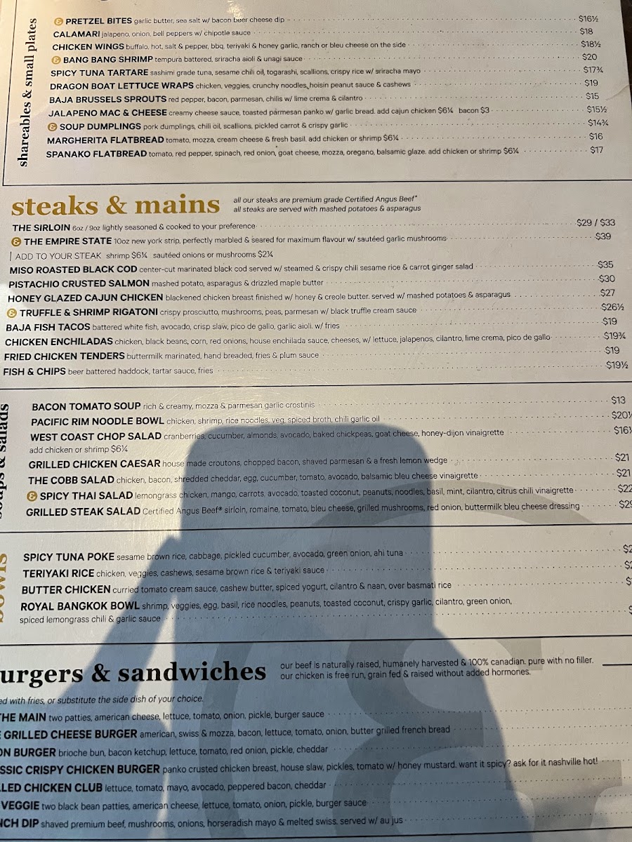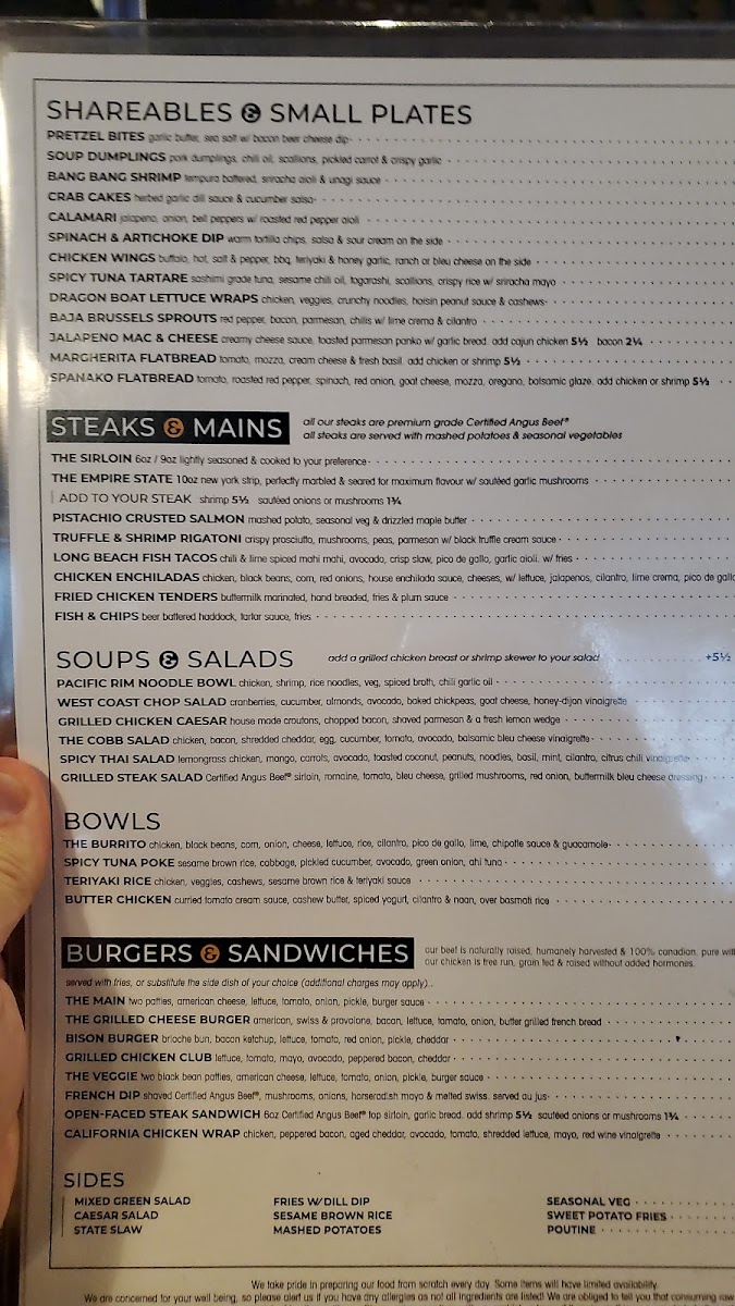 Welcome to State & Main, a delightful restaurant located at 1555 Regent Ave W in Winnipeg. Known for its cozy ambiance and vibrant atmosphere, this dining gem offers a menu brimming with culinary excellence. The star of the show is undeniably their premium AAA beef steaks, each cooked to perfection. Indulge in 6oz sirloin or the exquisite 10oz Empire State strip, paired with sautéed garlic mushrooms—each dish designed to tantalize your taste buds.